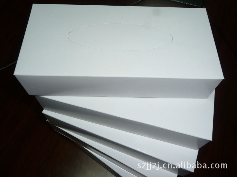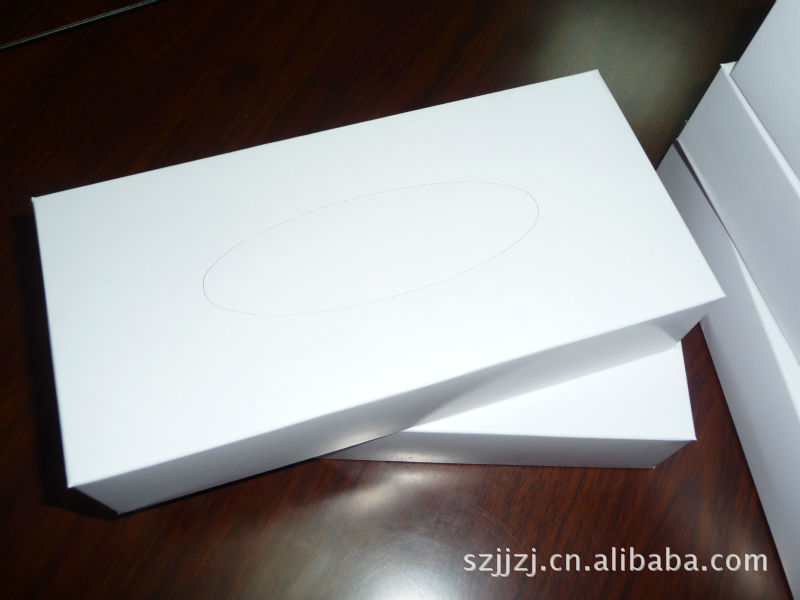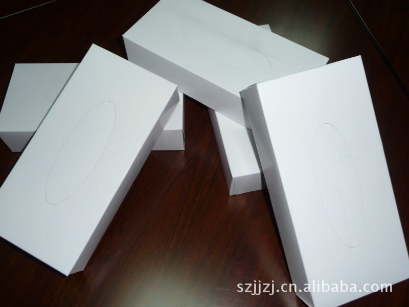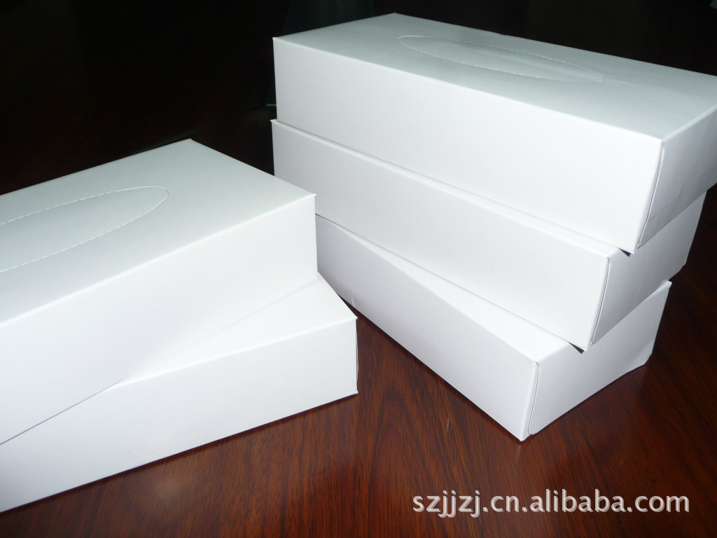 白盒装纸 纸盒材质:350g灰卡纸,可过油磨光,22*11*5cm;纸巾材质:100%进口原木浆纸,18*20或20*20cm/张,30-80抽/盒,80盒/箱;起订量3000盒起;价格:0.85元起,量多价格可另算。