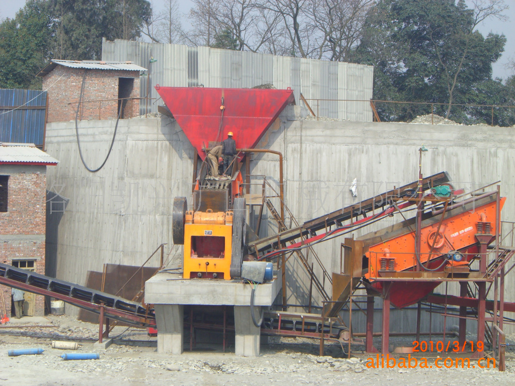 首先,石料由粗碎机(粗鄂式破碎机)进行初步破碎,然后,产成的粗料由胶带输送机输送至细碎机(细碎鄂式破碎机)进行进一步破碎,细碎后的石料进振动筛筛分出两种石子,满足制砂机进料粒度的石子进制砂机制砂,另一部分料返回再进细破。进制砂机的石子一部分制成砂,经洗砂机(可选)清洗后制成成品砂,另一部分进制砂机再次破碎,最终产出符合要求的各种砂料。