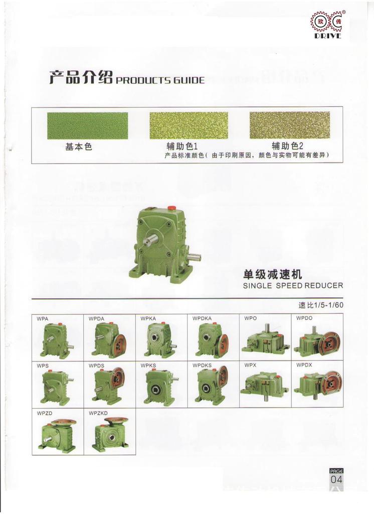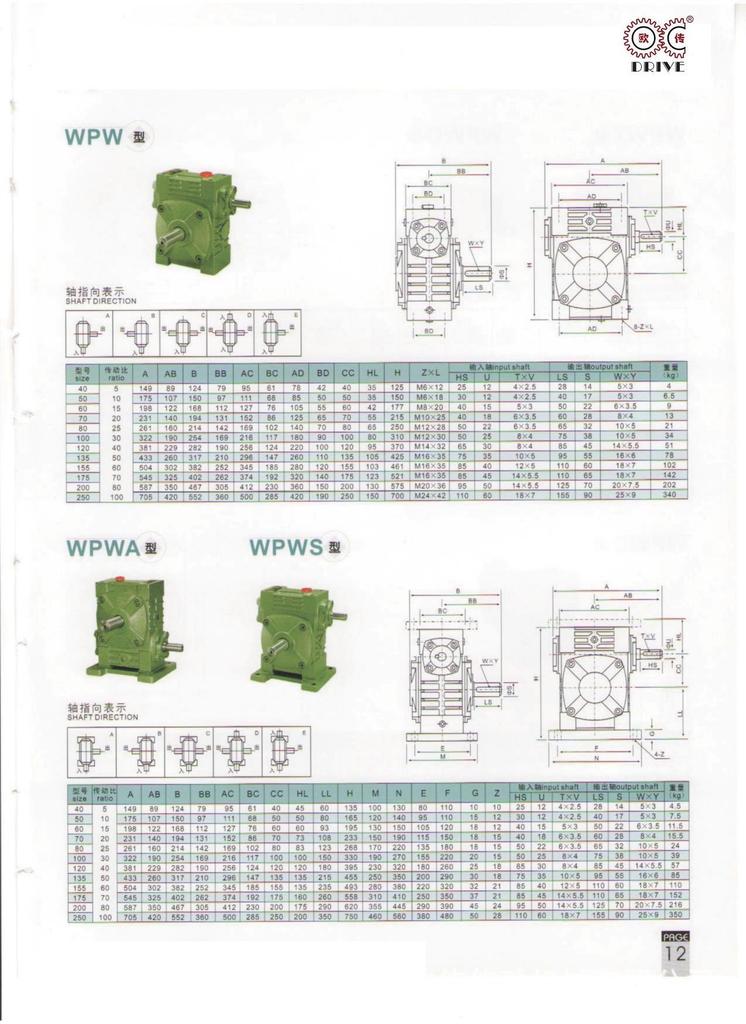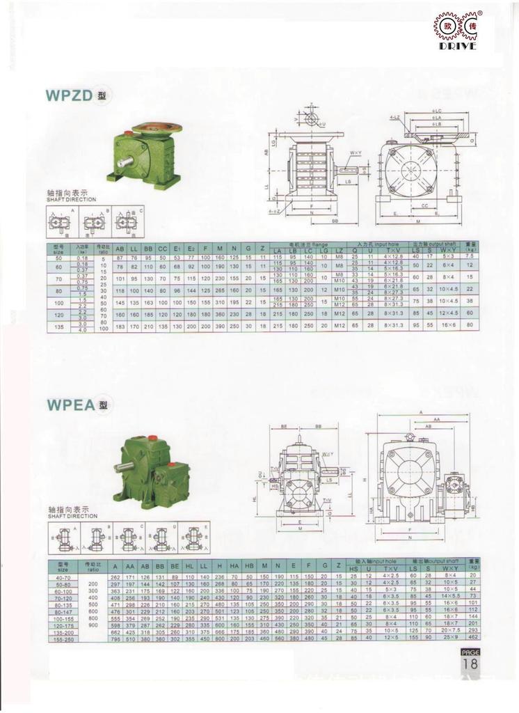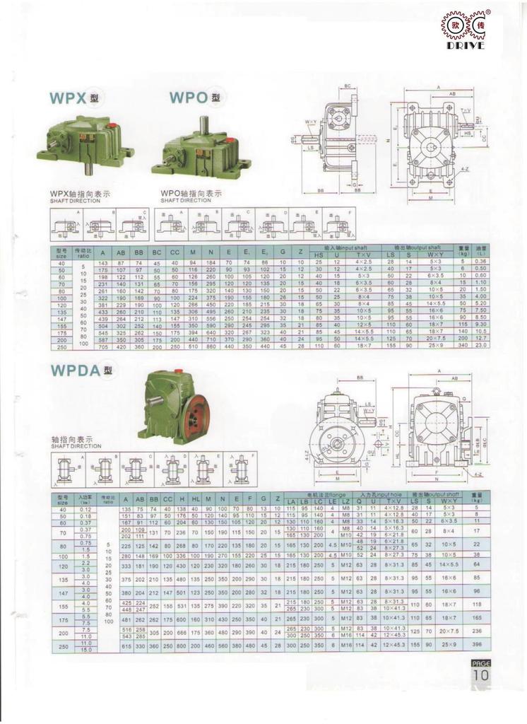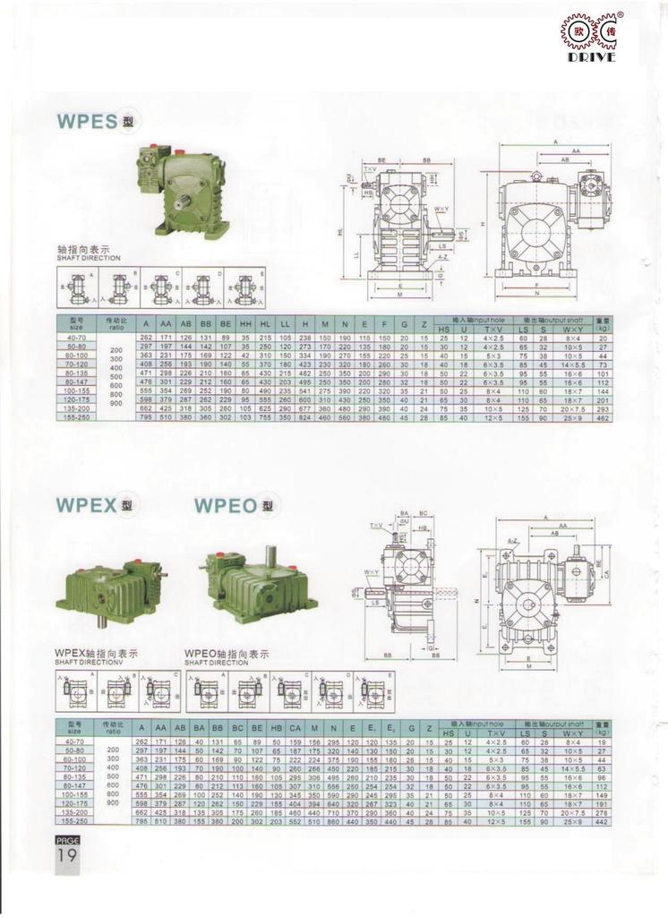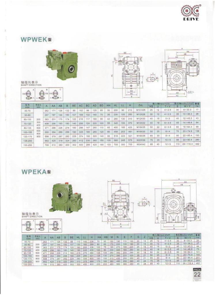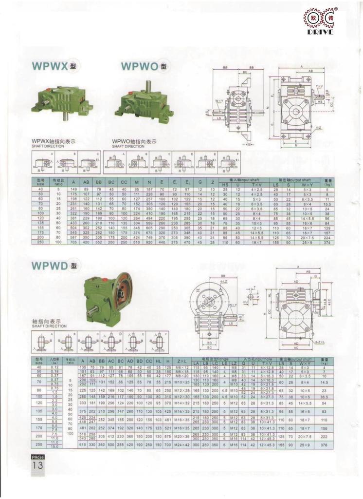性能、特点1、箱体结构为整体,外形美观大方、刚性好。2、箱体型式有基本型(箱体为带有底脚板的立式或卧式两种结构)和万能型(箱体为长方体,多面设有固定螺孔,不带底脚板或另装底脚板等多种结构型式)3、输入轴联接方式有基本型(单输入轴及双输入轴)、带电机法兰两种。4、输出轴结构有基本型(单输出轴、双输出轴)和中空输出轴两种。5、输出、输入轴位置方向有输入轴在下及在上;输出轴向上及向下;输入轴向上及向下。6、可用2台或3台减速机组成多级减速机,以获得极大的传动比。 本公司有WPA、WPS、WPX、WPO、WPD系列及WPW系列蜗轮蜗杆传动箱;