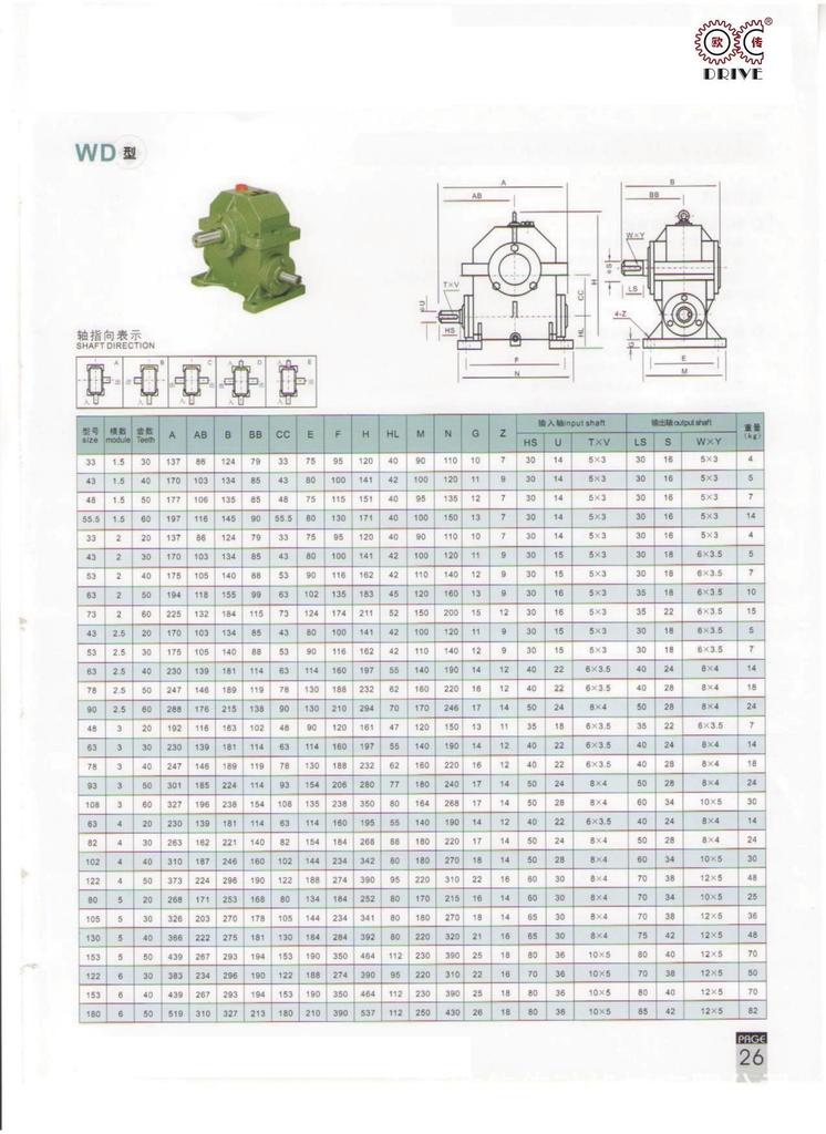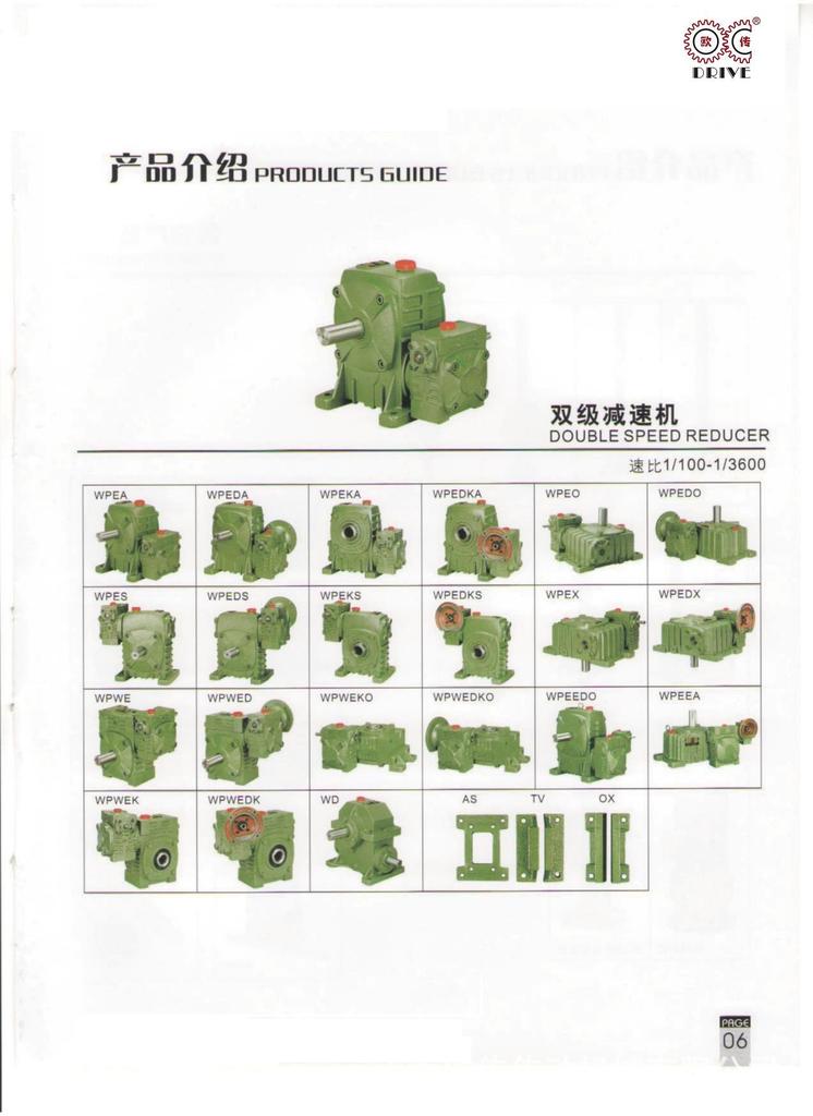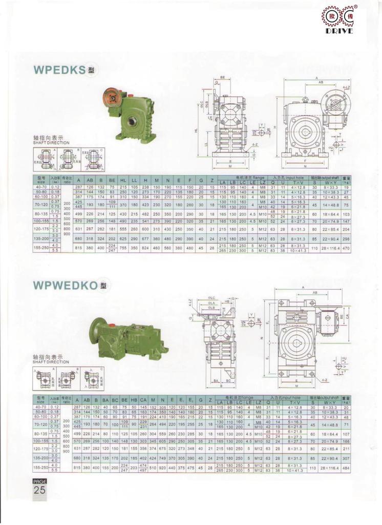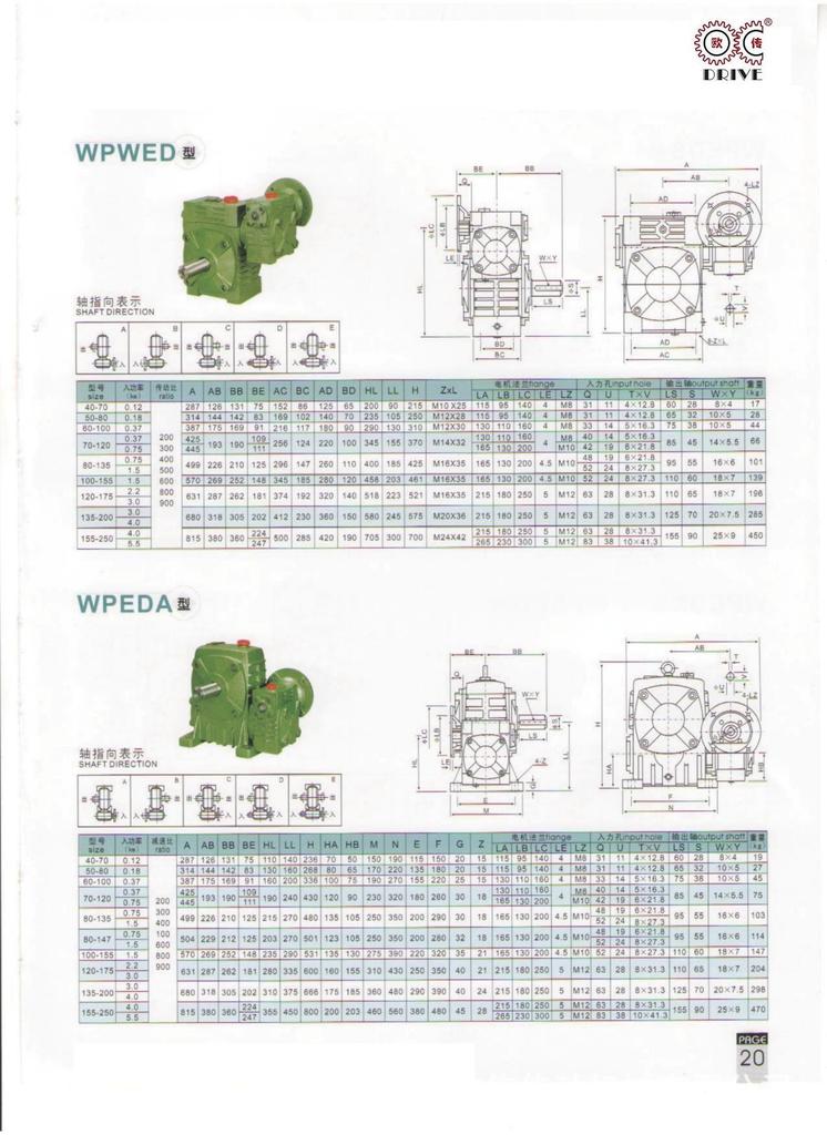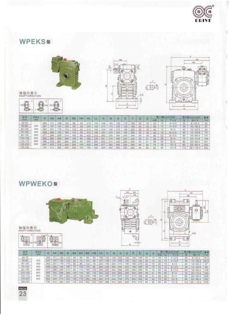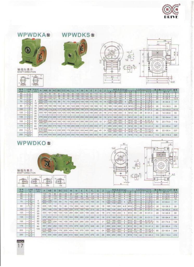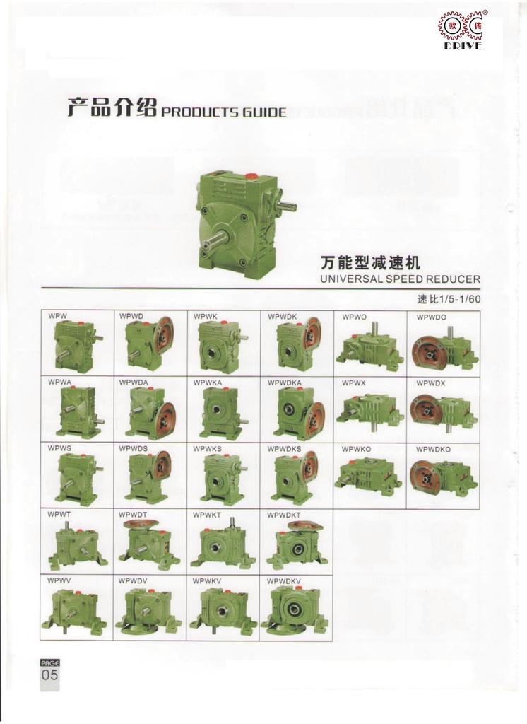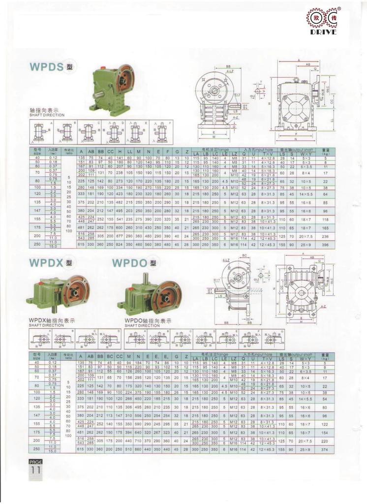 性能、特点1、箱体结构为整体,外形美观大方、刚性好。2、箱体型式有基本型(箱体为带有底脚板的立式或卧式两种结构)和万能型(箱体为长方体,多面设有固定螺孔,不带底脚板或另装底脚板等多种结构型式)3、输入轴联接方式有基本型(单输入轴及双输入轴)、带电机法兰两种。4、输出轴结构有基本型(单输出轴、双输出轴)和中空输出轴两种。5、输出、输入轴位置方向有输入轴在下及在上;输出轴向上及向下;输入轴向上及向下。6、可用2台或3台减速机组成多级减速机,以获得极大的传动比。 本公司有WPA、WPS、WPX、WPO、WPD系列及WPW系列蜗轮蜗杆传动箱;