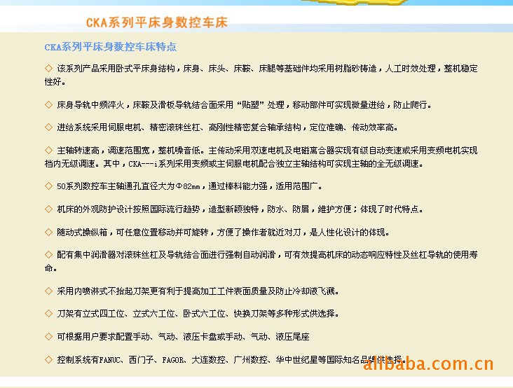 CKA系列数控车床选用FANUC、西门子、华中世纪星、FAGOR、大连数控等国内外知名公司的数控系统,对工件可进行多次重复循环加工。该机床为通用型产品,主要承担各种轴类及盘类零件的半精加工及精加工。可加工内外圆柱面、锥面、端面、切槽、倒角及螺纹、镗孔、铰孔及各种曲线回转体.