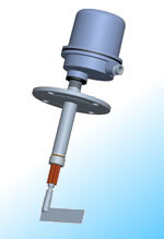 UL型物位计采用摆动式传动系统。检测板受阻时,主轴受阻而静止、电机继续运行,使脱扣器脱扣,致使开关动作切断电机电源、电机停止工作,发出物位信号。