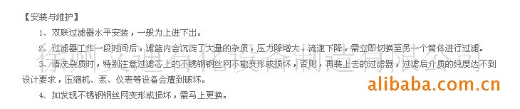双联过滤器是也称双联切换过滤器它是由两台不锈钢过滤器并联而成,具有结构新颖合理、密封性好、流通能力强、操作简便等诸多优点,应用范围广泛、适应性强的多用途过滤设备。尤其是滤袋侧漏机率小,能准确地保证过滤精度,并能快捷地更换滤袋或者滤网,过滤基本无物料消耗,使得操作成本降低。
