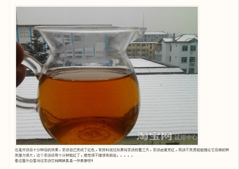 4、 气。关于茶气,众说纷纭,没有一个准确的说法。但是此茶饮过后,不到10分钟,生理方面便会明显感觉后背毛孔炸动,轻汗微发,腹内热气涌动。心理上就只能自己体会,但是总会是精神大振,疲劳烦闷一扫而空。