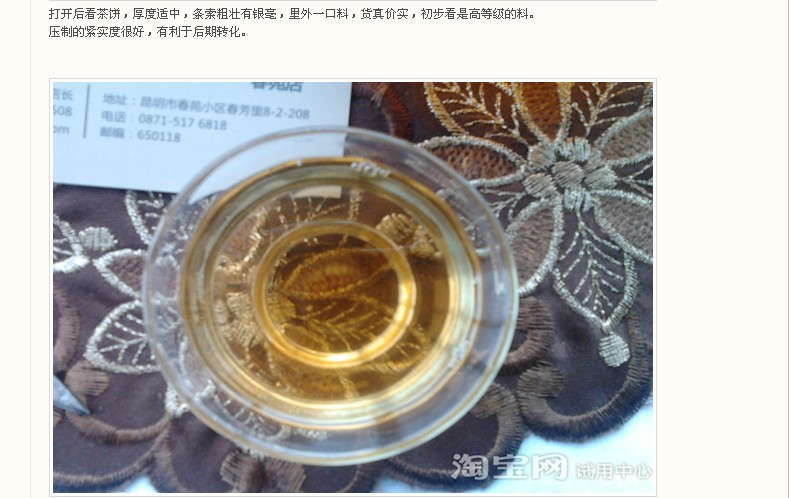 2、 香。饼面有淡淡清香;开汤后,明香不显,杯底有淡淡兰香,茶汤泼于茶盘时,香气随热气四溢;暗香浓郁,入口后满嘴溢香,从舌尖到喉部,可谓满口香。