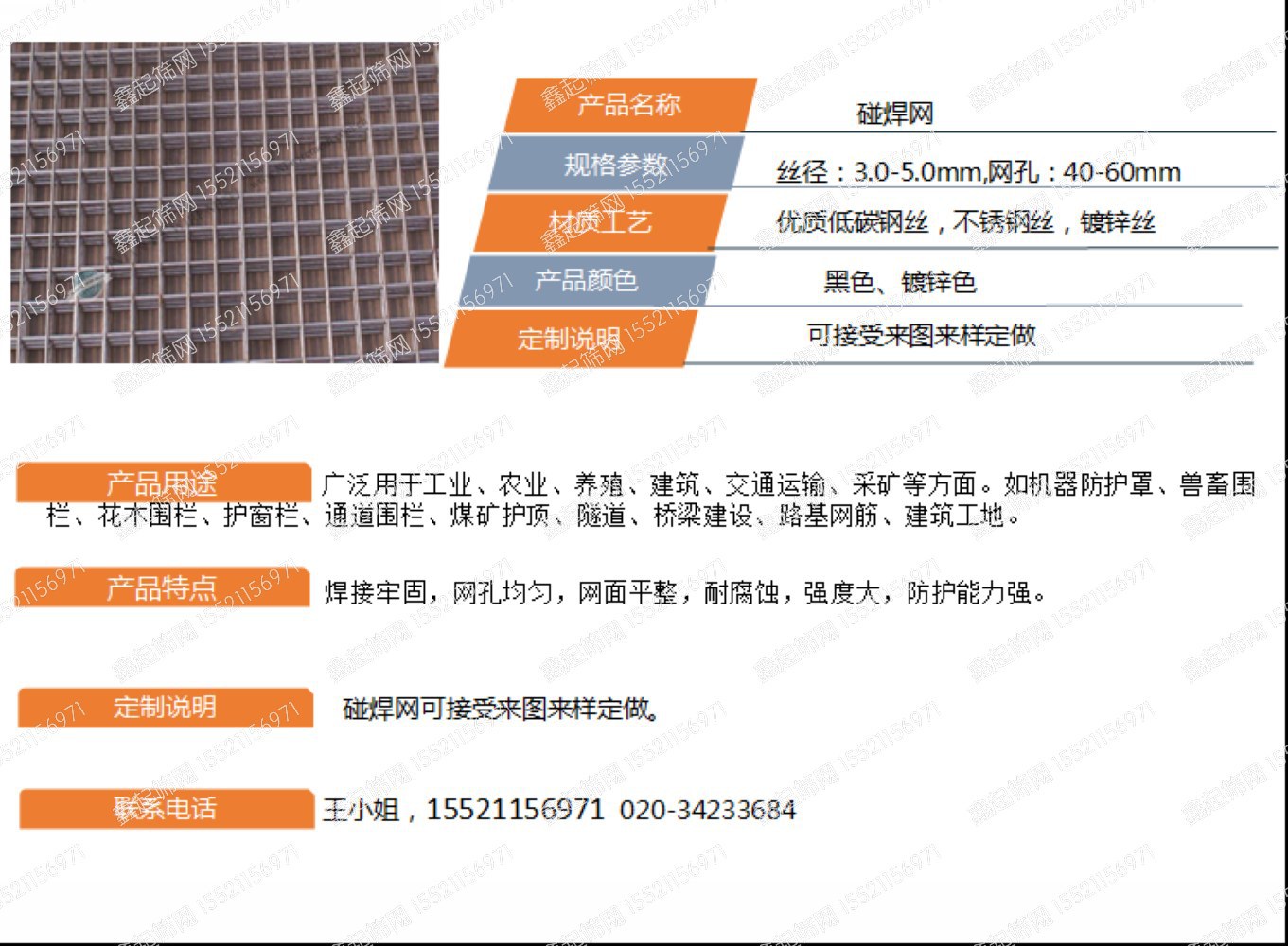 3、工艺:碰焊网是用不锈钢丝、电镀锌丝、冷镀锌丝,pvc丝,铁丝等碰焊而成,
