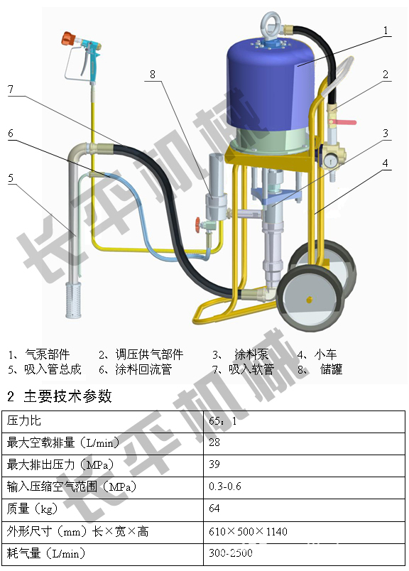 2、采用分体式双作用增压泵,该泵气动马达与涂料柱塞泵采用分体外连式结构,两泵体间装上润滑油杯,活塞杆得到良好的润滑,高压涂料被有效阻断,绝不“窜缸”。拆卸、维护、保养非常方便。