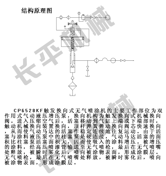 CP6528KF触发换向式无气喷涂机,是我厂最新开发成功的具有国内领先水平的气动式无气喷涂机。该机采用了具有完全知识产权的多项专利及我厂独有的“气缸密封圈滚动运行”和“气缸低温润滑”新技术。彻底攻克了以往气动式无气喷涂机普遍存在的“死机”(停机)、“冰堵”和涂料“窜缸”的普遍性难题,技术性能非常卓越,特点突出。