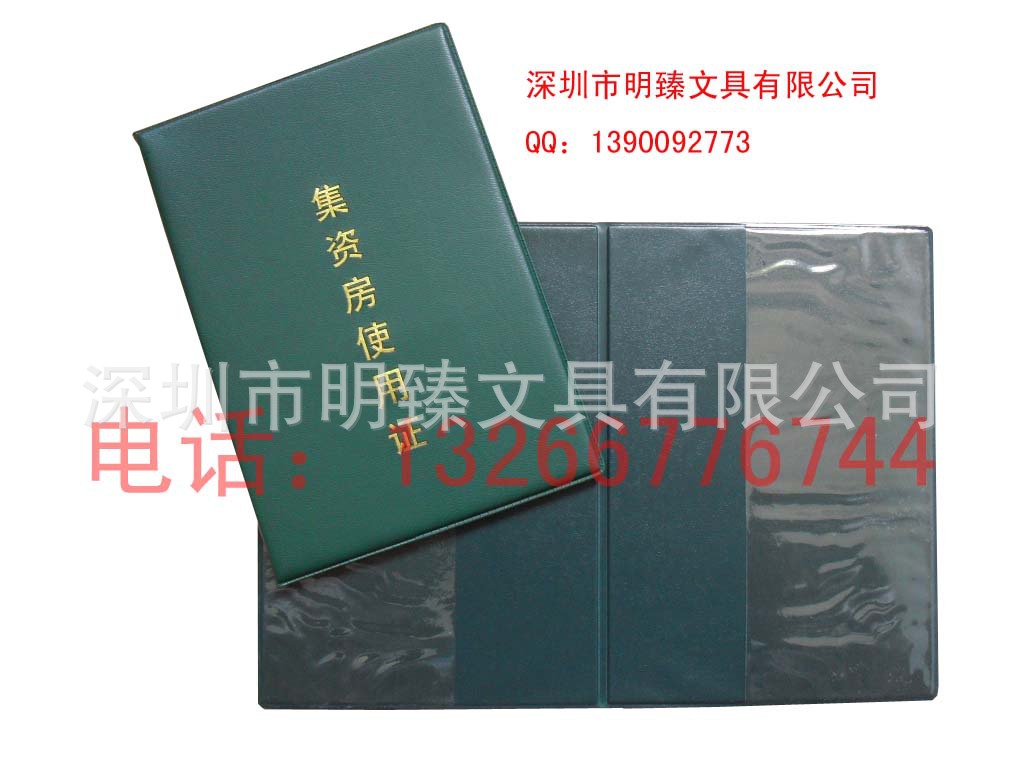 编号:PVC文件套(集资房使用证)尺寸:130*185(MM)材质:文件夹封面及内衬分别为绿色PVC胶料,包900克灰板,周边电压,正面烫金,打开二边做插兜。