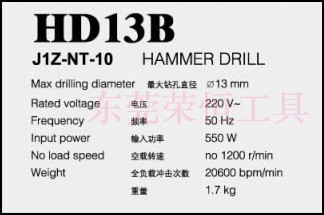 技术参数:钻孔直径:13mm(3/8")电压:220-V频率:50 Hz空载转速:2200 RPM输入功率:550 W重量:2.2Kg,