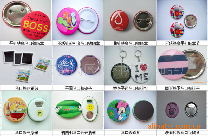马口铁制品类:马口铁胸章、徽章、镜子马口铁胸章、开瓶器马口铁胸章、马口铁冰箱贴等的广告礼赠品。