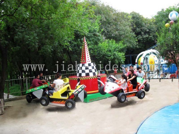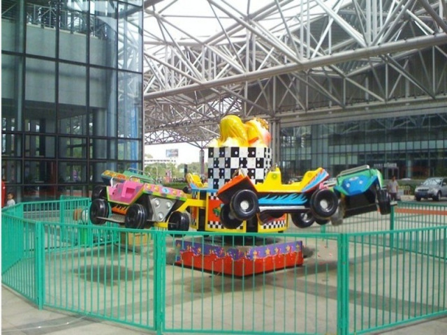 弹跳车是一款弹跳楼的游乐设备,游客乘坐其中,绕中心旋转,同时飞车上下跳动,伴随着动感刺激的音乐,在飞上飘下的倾斜回转运动中,体验超重、失重以及离心的感觉。新颖的造型,变幻的灯光装饰,使游客仿佛置身于逛飙的汽车中,游客特别是儿童流连忘返。