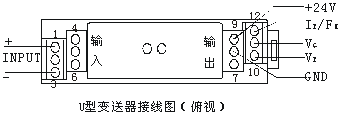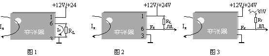 六、典型接线示例 (1)电流输出型( IZ)变送器的输出为共地电流源,接线原理见图1,图中RL是用户负载。 (2) 频率输出型( FK)变送器的输出级为集电极开路门 ( NPN管) 结构,使用时须外接上拉电阻RL,IR=3~10mA。输出脉冲为方波,脉冲的幅度约等于上拉电源的电压值。接线原理见图2或3。  |