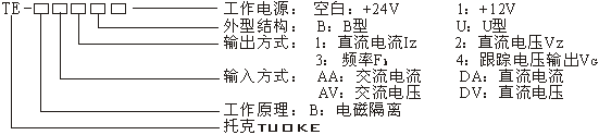 注意: 1、定货型号应包括:变送器主型号、输入/输出规格(输入/输出范围值)、精度等级等。例如:TE- BAA1U-5A/4~20mA-0.5。 2、电流变送器:输入电流值大于5A后,交流须外加互感器,直流须外加分流器。 3、电压变送器:输入电压值大于500V后,交流须外加互感器,直流须外加分压电阻,测量范围可达1KV。