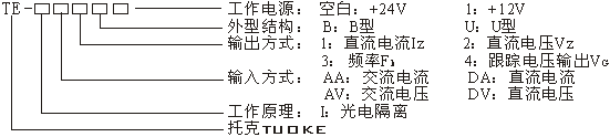 注意:1.定货型号应包括:变送器型号、输入/输出规格(输入/输出范围值)、精度等级等。例如:TE- IAV2U-250V/1~5V-0.5。