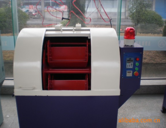 本机器采用行星传动方式,利用离心运动原理。有4个 6角滚筒装载于料斗中(料斗固定装载在转动盘上;58型以上滚筒固定在转动盘上。),当转动盘转动时,滚筒以逆方向转动。将工件、研磨石、水与抛光助剂放进滚筒后,将滚筒予以固定时,物体被离心力转动,此时物体受滚筒槽的强压力(参照图)