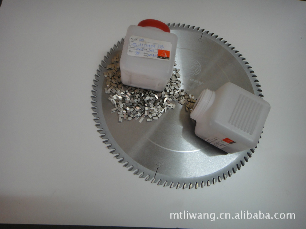 硬质合金锯片由锯板和硬质合金锯齿两部部组成。硬质合金锯齿目前基本上是进口的,我们公司采用卢森堡CERMETAL硬质合多。优质锯片所用的合金颗粒较厚、较大,因为这样的合金锯齿可经多次刃磨,使用寿命长,硬质合金的焊接质量也十分重要,焊缝要薄并且均匀,这样锯齿上能承受更大的切削力。锯片锯板的质量是十分重要的。因为锯片调整旋转,它既要传递切削力又要保持工作的稳定性。优良的锯片不仅具有静态儿何尺寸和精确度,更重要的是它的动态特性。当锯片连续切削时,合金锯齿切削所产生的热会传导给锯板,使锯板的温度升高,优质的锯板在这种情况下还能保持表态的精度,而质差的锯片就会发生锯板翘曲,影响锯切精度。锯板的动态稳定性对于几片锯片成组使用的精况尤为重要。当多片锯设备使用一组不稳定的锯片又如何能保证纵向开料的质量。锯板和刀头是优质锯片不可分割的组成部分。