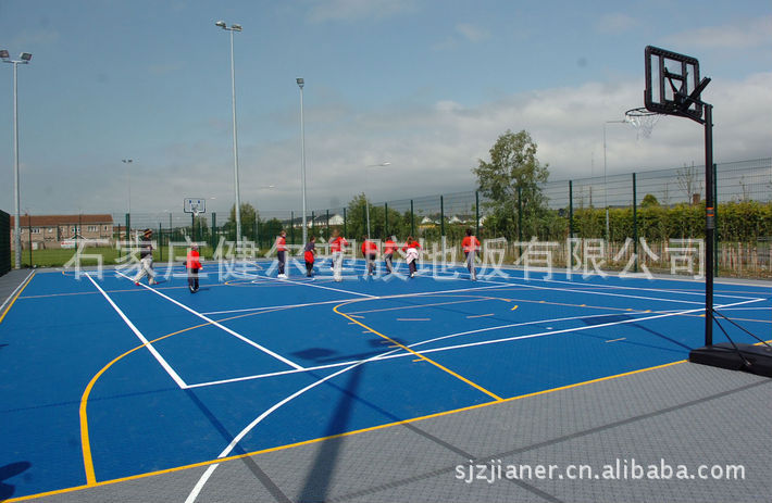 10、性价比高:悬浮式拼装运动地板目前在同类产品当中性价比最高,使用该产品投资少(基本不需要重新做基础)、维护成本低、档次高(超过50多位NBA巨星私人训练场地都使用该种产品铺设的地板,乔丹一人就铺设了6块场地)、见效快(铺装画线完成即可使用),是各类运动场地铺设的最佳选择。初始建设费用+零维护费(只需用清水冲洗即可,没有任何负面作用。),使用寿命长达10年,不褪色不变形。场地划线用漆使用聚丙稀面层专用漆,不脱落。