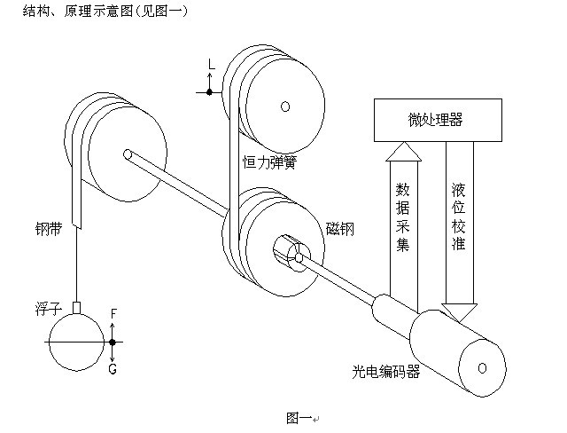 当液体比重恒定时,液面变化的多少浮子就跟随变化多少。通过磁耦合将轮鼓旋转的角度传给光电编码器,经数据采集器,将信号送入微处理器进行计算处理,计算后得到液位的高度值。将液位的高度值变成标准信号传输给控制室。