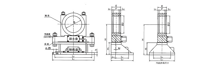 | 起重量(t) | 滑轮倍率 | 传感器规格 | Φ | H | H1 | L4 | L5 | L1 | L2 | L3 | M | h | Φ1 | Φ2 | E | F | L9 | | 5,10 | 2,3 | 1.5 | 140 | 300 | 149 | 140 | 300 | 355 | 220 | 55 | 0 | 16 | 18 | 148 | 75 | 45 | 7 | | 16,20 | 3,4 | 2.5 | 170 | 320 | 144 | 210 | 355 | 420 | 300 | 55 | 0 | 16 | 22 | 178 | 100 | 70 | 7 | | 32 | 4 | 4 | 200 | 400 | 204 | 200 | 410 | 490 | 300 | 65 | 0 | 16 | 22 | 208 | 100 | 70 | 7 | | 50 | 5 | 5 | 200 | 460 | 264 | 200 | 460 | 520 | 300 | 65 | 0 | 20 | 22 | 208 | 100 | 70 | 7 | | 75(A) | 5 | 7.5 | 200 | 400 | 204 | 200 | 410 | 490 | 300 | 65 | 0 | 16 | 22 | 208 | 100 | 70 | 7 | | 75(B) | 5 | 7.5 | 200 | 320 | 124 | 200 | 300 | 420 | 300 | / | / | 28 | 37 | 212 | 100 | 66 | 7 |