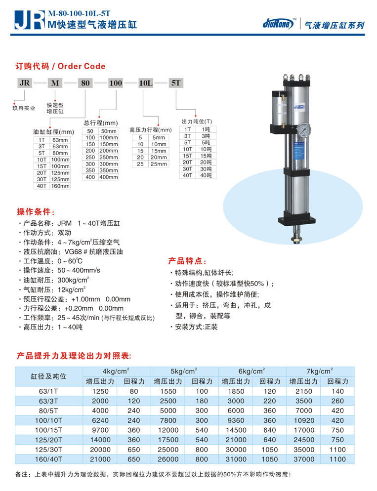 JRM快速型液压增压缸特点:速度快,稳定.其工作速度系标准型增压缸的1.5倍.系真正能达到效益,效率双收的效果.产品整体结构合理,体积较长,适用于安装不受限制且对工作频率要求较快的工作场合.