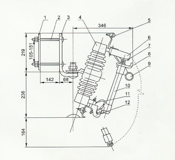 编号No. | 部件名称 | 编号No. | 部件名称 | 1 | 背板 | 7 | 上触头 | 2 | 长螺杆 | 8 | 附属钩 | 3 | 安装支架 | 9 | 操作环 | 4 | 瓷件(或陶瓷绝缘子) | 10 | 熔丝管 | 5 | 接线座 | 11 | 套环接头 | 6 | 上支座 | 12 | 下支座 |