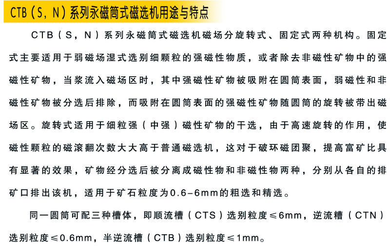 本机适用于湿法选别粒度为0-6毫米的强磁性矿物,将矿物分为磁性物和非磁性物两部分。它所选别的强磁性矿物的比磁化系数X≥3000×10-6厘米³/克,属于这类的矿物有磁铁矿,磁黄铁矿。对于赤铁矿,褐铁矿,菱铁矿等需预先进行磁化焙烧,再进行选别。