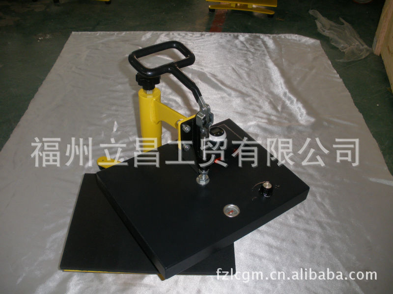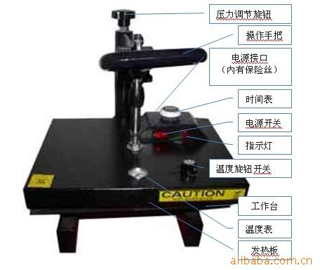 待机器达到所需温度时,将需要转印的物品平铺放置在工作台面上,压下手把,同时按下定时器,达到设定的时间后,机器发出警示音,提起手把完成一次操作。