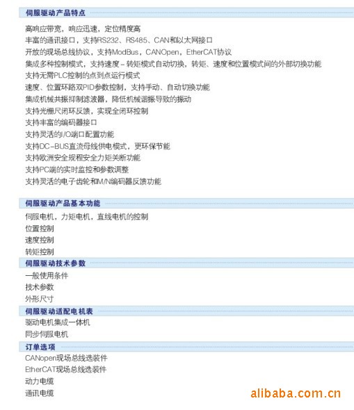 四. 点到点控制:16个自由可编程的定位设定,支持相对模式和绝对模式的单轴定位功能;自动完成原点查找功能;可分别设定每个位置的最大速度.加速度和最大转矩;支持最多4个开关量信号选择终点位置,重复定位精度高,设定简便,无需外部PLC即可完成定位控制,适用于各类自动化设备的单轴进给,顺序或转盘定位等应用