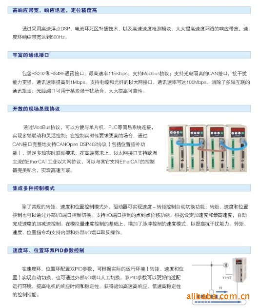 二. 速度控制:支持16种内部速度指令,可通过开关量信号选择;支持外部模拟量输入的速度控制;支持抗干扰能力更强的数字脉冲控制和速度控制;支持RS232,RS485端口的速度指令