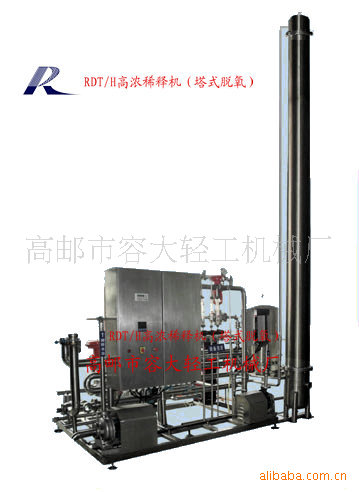 塔式脱氧水制备系统是国外技术基础上加以消化吸收而开发的一种产品。产品脱氧性能精度高、稳定性好,可靠性强,设备广泛应用于各种需要高纯度脱氧水的应用场合。塔高约6米,直接将酿造水进入脱氧塔进行脱氧;采用二氧化碳置换,在完成脱氧的同时脱氧水也达到了部分碳酸化目的。脱氧水在经过薄板冷却后与清酒混合达到客户需要的成品酒。薄板冷却温度采用自动控制系统,为了让稀释水中二氧化碳含量达到稀释水的工艺指标,系统配备了二氧化碳饱冲器,确保二氧化碳在水中的稳定性。清酒和脱氧水混合通过模块控制脱氧水流量,确保混合精度。系统通过微机自动完成。