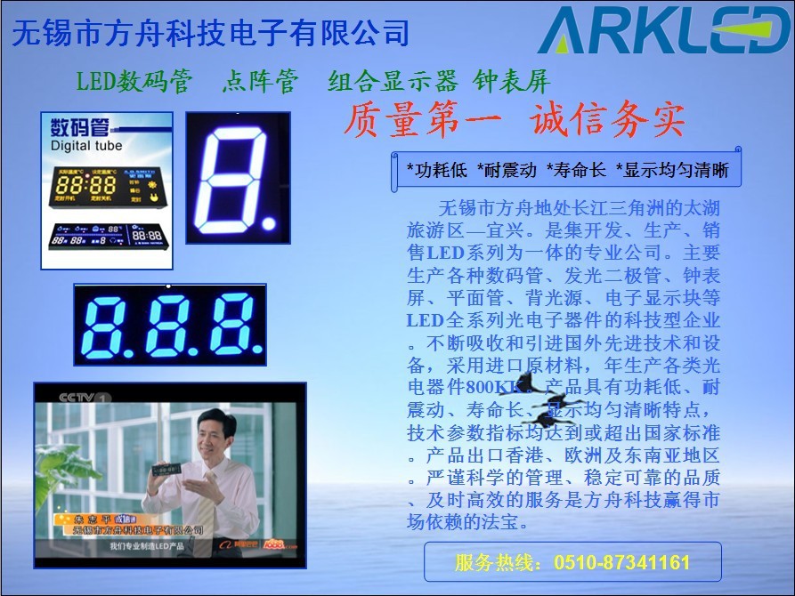 我们将一如继往地奉行以“质量是生命、客户是上帝”的宗旨,坚持以“品种多、质量优、价格低”为特色。我们可根据客户需求定做各种型号的数码管!热忱欢迎各界新老客户前来洽谈选购。ww.arkch.com或来电咨询!0510-87341161 ,来电来函必复.