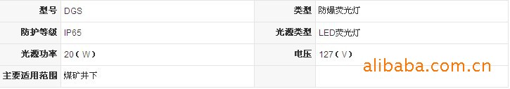 DGS 类型 防爆荧光灯 防护等级 IP65 光源类型 LED荧光灯 光源功率 20(W) 电压 127(V) 主要适用范围 煤矿井下