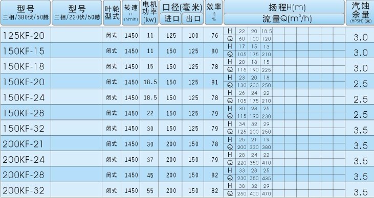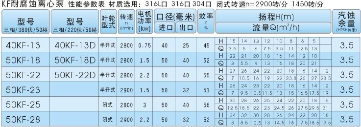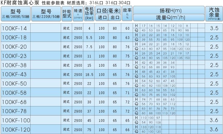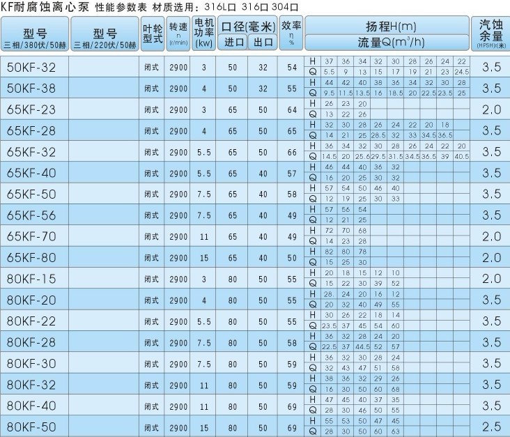 KF不锈钢耐腐蚀离心式排污水泵 广东托架式不锈钢离心泵 厂家直销 产品说明: 不锈钢材质分:304,316,316L三种不同材质,可根据客户输送介质不同腐蚀程度而定。 本产品机封有两种设计:内置机封/外装机封。 应用范围: 适用于输送有一定腐蚀性的液体,清洗系统,食品加工,医药卫生,污水处理,电镀漂染,精细化工等,以及环保工程,或者与其他工业系统。 性能及优点: 可输送有一定腐蚀性的液体, 结构稳固,紧凑,无振动,噪音低,运行平行可靠,工作范围广,维修方便 可选配多种电机,多种控制设施, 采用优质机械密封,无泄漏,使用寿命长 采用开式叶轮,能处理污水和含细微杂物的液体,输送能力强 KF系列不锈钢离心泵采用的不锈钢轴承。 型号参数: 40KF-13 50KF-18 50KF-22 50KF-23 50KF-25 50KF-28 50KF-32 50KF-28 65KF-23 65KF-28 65KF-32 65KF-40 65KF-50 65KF-56 65KF-70 65KF-80 80KF-15 80KF-20 80KF-22 80KF-28 80KF-30 80KF-32 80KF-40 80KF-40 80KF-50 80KF-58 80KF-68 80KF-80 80KF-100 80KF-110 80KF-120 100KF-14 100KF-18 100KF-20 100KF-23 100KF-38 100KF-43 100KF-50 100KF-58 100KF-68 100KF-78 100KF-100 100KF-120 80KF-28 80KF-28 80KF-32 100KF-10 100KF-14 100KF-17 100KF-20 100KF-25 100KF-28 100KF-32 125KF-15 125KF-18 125KF-20 150KF-15 150KF-18 150KF-20 150KF-24 150KF-28 150KF-32 200KF-21 200KF-24 200KF-28 200KF-32 |