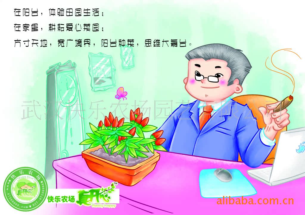武汉快乐农场园艺公司依托湖北省农科院蔬菜科学研究所, 整合多年的科研成果,秉承环保理念, 成功地将现代农业种植技术浓缩到城市家庭阳台、露台、庭院、楼顶和室内等闲置空间进行有机蔬菜种植,开发出了“快乐农场”系列产品(农场集装箱、箱式农场,开心芽菜园,开心土豆园,空中番茄,空中菜篮等),同时引进国外一些观赏性特佳的蔬菜种子如美国七彩甜椒、韩国迷你白菜、非洲红茄、澳洲芥蓝等等,该技术采用轻质环保的天然栽培介质,配以农科院选育的优质抗病蔬菜品种和美观耐用的环保栽培容器,解决了常规栽培土壤笨重、易板结、不透气的难题,简化了家庭种菜管理程序,帮助现代城市居民实现人人拥有私家有机农场的梦想,享受劳动与丰收的快乐,缓解压力, 陶冶情操, 提高孩子的注意力、记忆力、思维力、想象力,培养孩子动手能力。对于构建和谐社会,和谐家庭,提倡环保健康的生活方式有积极的作用!