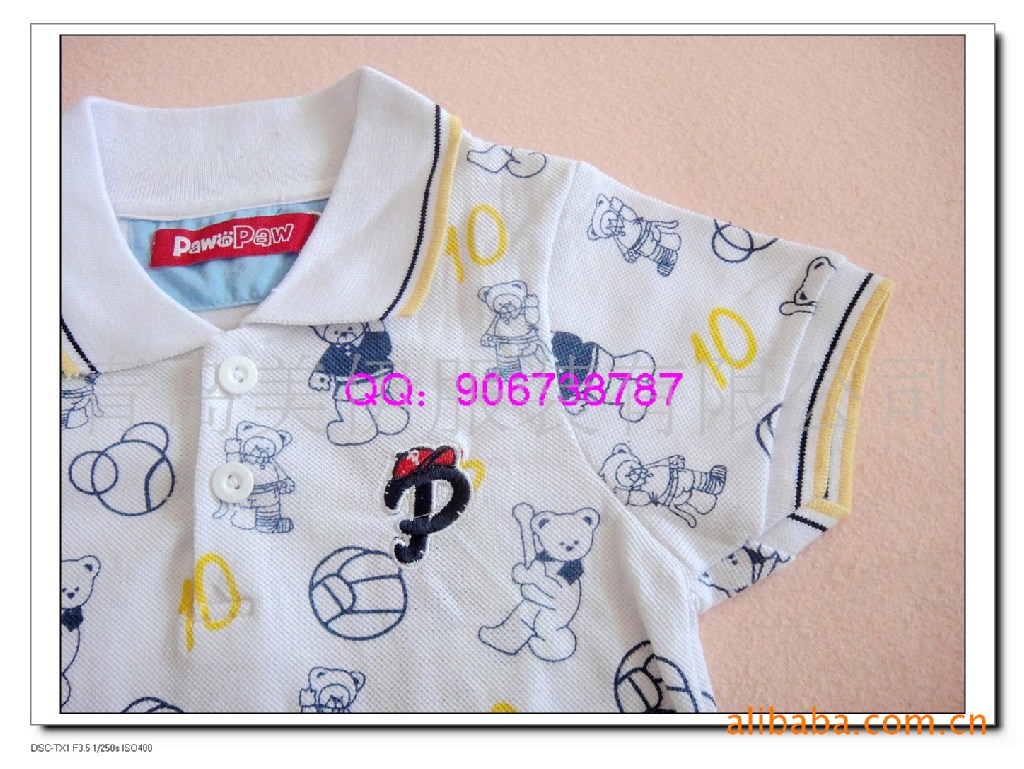 此款是满印小熊系列,翻领设计,绣有可爱的P字母,胸前有纽扣方便宝宝穿脱!