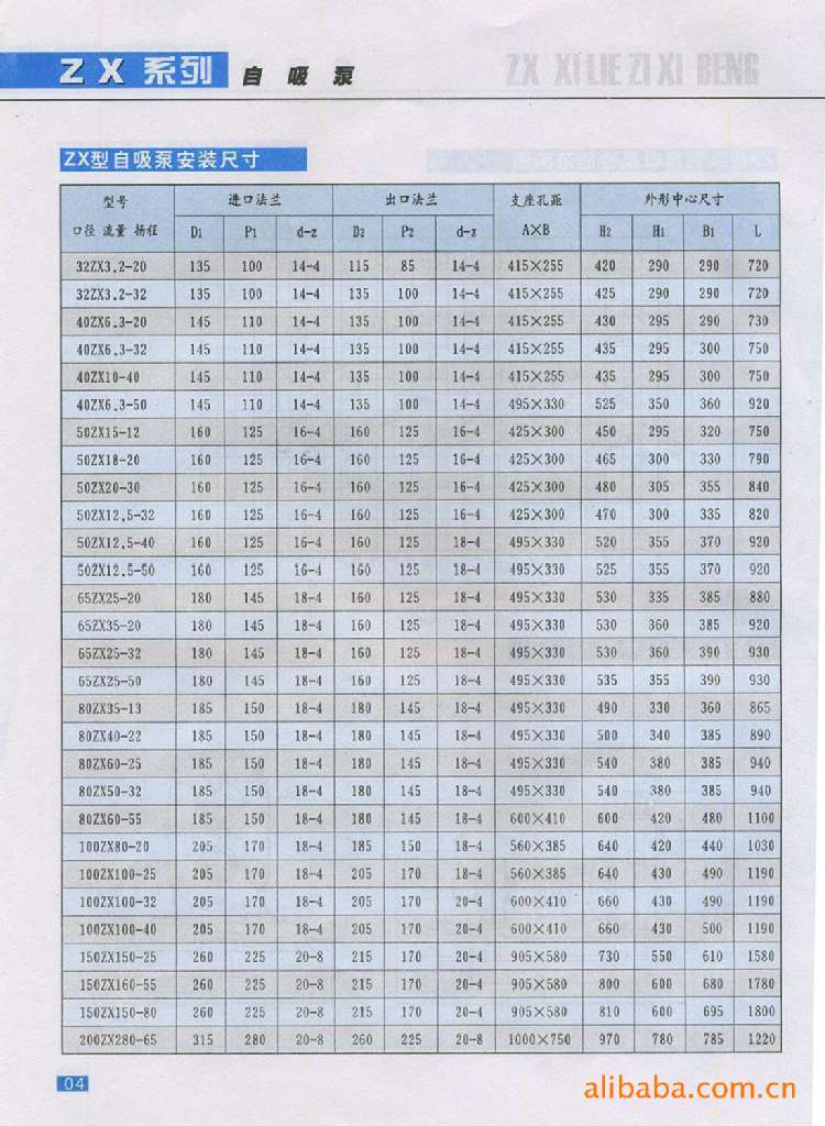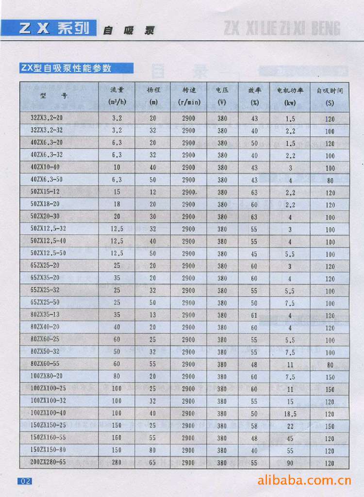 ZX型清水自吸式离心泵 一、产品概述: ZX型清水自吸式离心泵是我司根据国外先进技术改进后研制而成的节能泵类产品。具有结构紧凑、操作方便、运行平稳、维护简单、效率高、寿命长,自吸能力强等特点。本泵管路中不需安装底阀,工作前只需保证泵体内储有定量引液即可,既简化了管路系统,又改善了劳动条件。 二、适用范围: 1、适用于城市环保、建筑、消防、化工、制药、染料、印染、酿造、电力、电镀、造纸、石油、矿山、设备冷却、油轮卸油等。2、适用于清水、海水及带有酸、碱度的化工介质液体和带有一般糊状的浆料(介质粘度≤100厘珀、含固量可达30%以下)。3、装上摇臂式喷头,可将水冲到空中后,散成细小雨滴进行喷雾,是农场、苗圃、果园、茶园的良好机具。4、可和任何型号、规格的压滤机配套使用,将浆料送给压滤机进行压滤的最理想配套泵种。 三、型号意义: 50 ZX 12.5-50 PB 50 – 吸入口径(mm)ZX – 自吸泵12.5 –额定流量 (m3/h)50 –额定扬程 (m)P – 不锈钢材质B – 防爆电机 四、技术参数: 流量:3-280m3/h;扬程:12-80m;电机功率:1.5-90kw;转速:1450、2900r/min;口径:32-200mm;介质温度:≤80℃;自吸高度:3.5-4.5m。__________________________________________________________________ 小贴士1:尽量缩短吸入管路的长度,少装弯头,有利于提高自吸性能。小贴士2:自吸泵第一次使用时,仍需将泵腔灌满液体。小贴士3:常规运行3000小时后,需对水泵进行拆检保养,必要时更换不宜再用的易损件。小贴士4:此泵可定做直联式,同心度高,稳定性增强,亦更为经济,不过维修稍嫌麻烦。