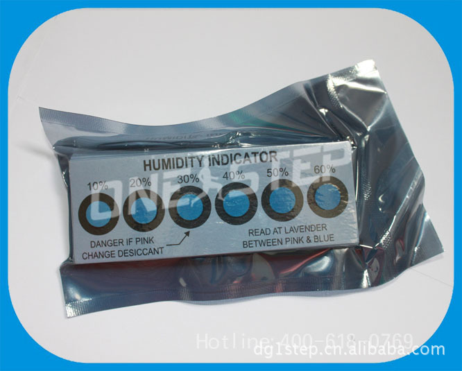 无钴湿度卡是用来指示产品包装容器内相对湿度大小的。相对湿度RH是指一定容积内空气的湿度饱和百分比。货物在贮存和运输过程中不发生霉变的决定因素是相对湿度RH<50%,相对湿度RH可用干燥剂控制,而当干燥剂吸水达到一定程度后就会失去作用。无钴湿度卡可以很方便地检测出密闭包装里的相对湿度,当指示点变成蓝色的时候,指示点中的数值就是当前的环境湿度。无钴湿度卡是一种便捷而廉价的检测环境中的湿度是否安全的方法。如果包装中的湿度到了或者曾经到过该湿度值的话,卡片上的点就会从棕色变成蓝色。使用本公司的无钴湿度卡产品,可以使您的产品特别是一些精密的产品免去受潮的危险。