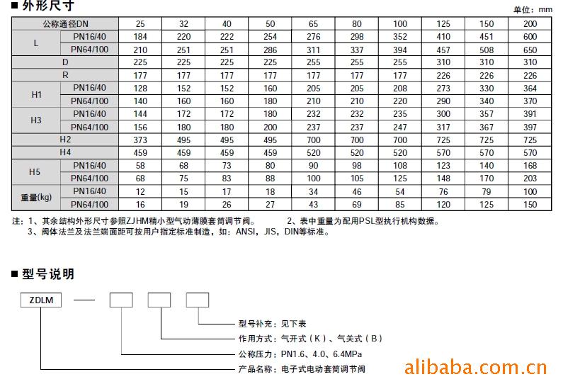 ■概述 ZDLM电子式电动套筒调节阀,由3810L型(或PSL系列)直行程电子式电动执行机构和精小型套筒阀组成。内含饲服功能,接受统一的4-20mA或1-5V·DC的标准信号,将电流信号转变成相对应的直线位移,自动地控制调节阀开度,达到对管道内流体的压力、流量、温度、液位等工艺参数的连续调节。主要特点如下: 1、 采用平衡型阀芯,不平衡力下,允许压差大,操作稳定。 2、 阀芯导向面大,可改善由涡流和冲击引起的振荡。 3、 比普通的单、双座调节阀噪声降低10dB左右。 4、 结构简单,装拆维修方便。 ■阀体 型 式:直通单座铸造球型阀 公称通径:20、32、25、40、50、65、80、100、125、150、200mm 公称压力:PN1.6、4.0、6.4MPa 法兰标准:JB/T79.1-94、79.2-94等 材 料:铸钢(ZG230-450)、铸不锈钢(ZG1Cr18Ni9Ti、ZG1Cr18Ni12Mo2Ti)等 上 阀 盖:标准型-17~+230℃、散热型+230~+450℃、低温型-60~-196℃、波纹管密封-40~+350℃ 压盖型式:螺栓压紧式 填 料:V型聚四氟乙烯填料、含浸聚四氟乙烯石棉填料、石棉纺织填料、石墨填料 ■ 阀内组件 阀芯型式:单座柱塞型阀芯 流量特性:等百分比特性和线性特性 材 料:不锈钢(1Cr18Ni9Ti、1Cr18Ni12Mo2Ti、17-4PH、9Cr18、316L)、不锈钢堆焊司太莱合金、钛和耐腐蚀合金等 ■ 执行机构 型 式:电子式电动执行机构(如PSL、3810等) 电 源:220V或380V 输入信号:4-20mA或1-5V·DC 输出信号:4-20mA·DC ■ 阀作用型式 分电关式(B)或电开式(K)阀
