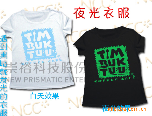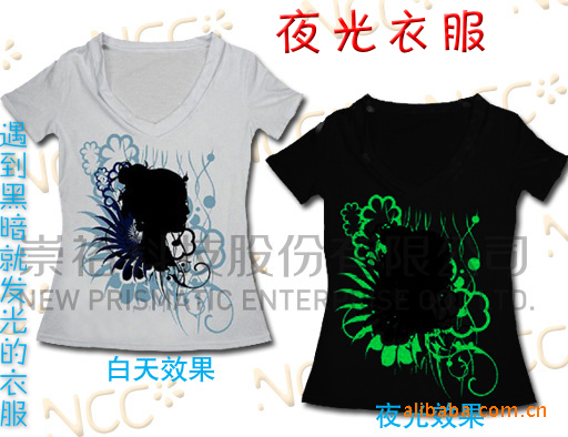 新型夜光T恤,通过吸收光源来达到自发光的效果,跟普通T恤相比多了在黑暗中发光的特性,在对工艺图案处理上运用水性夜光颜料为染料采用丝网印刷技术对图案进行印刷,达到颜色不脱落,不变色,着色均匀,附着里强等特点。从而更进了T恤上的新一代产品。