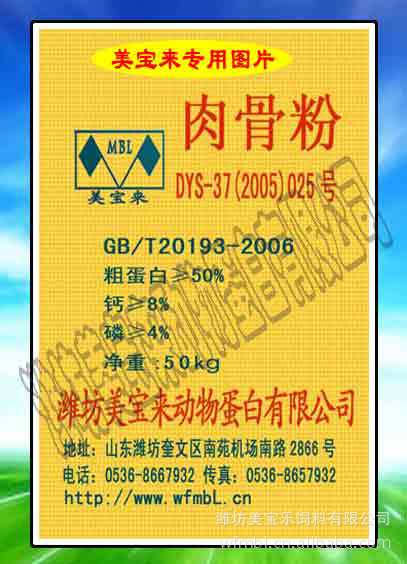 "美宝来"肉骨粉为浅黄色至棕黄色油性粉状物,流动性好,具肉骨粉固有气味,原料除季节性淘汰禽只及无害化处理动物胴体(含特种养殖动物)外,由本公司生产肉粉与骨粉按指标配制而成。绝无发生疫病动物组织成份,产品性能优越,指标稳定,有利于饲料加工企业对其蛋白、钙、磷、能量算入配方,充分合理利用,降低饲料成本,增加经济效益。