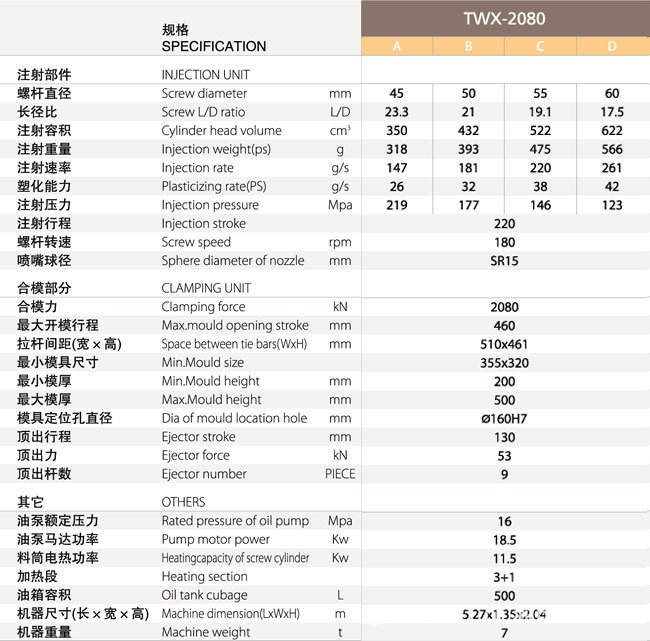 TWX系列注塑机是我公司在畅销多年的TW机型的基础上,经我司资深工程技术人员的潜心研究及不断的完善。对其锁模、注射以及整体机架等进行了有限元分析,机器的设计参数,整体性能,外观及结构都得到了全面的提升,是极富创造性设计的新机型。