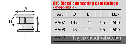 | 偏心连接件AA07-08-22 l 材质:澳大利亚3#锌合金 l 重量: l 直径: 15/16.5mm l 高度:11/12mm l 适用板厚度:16--20mm l 表面处理:镀锌/镀镍 |
