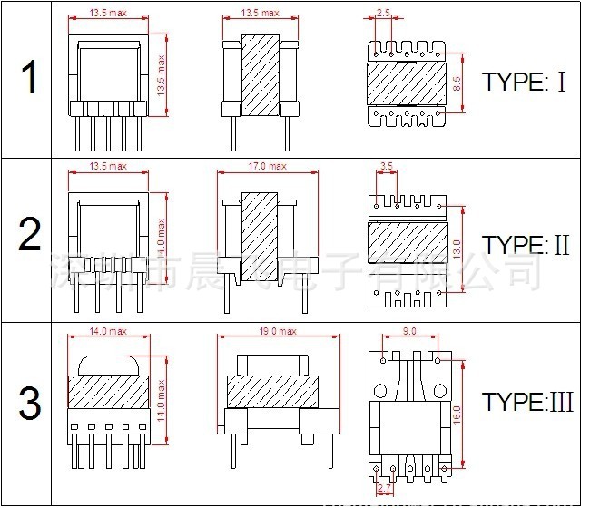 *:以上为公司常用骨架样式,其它款式暂未列入其中,欢迎咨询。本公司可按客户要求定制各种规格EE13高频变压器。