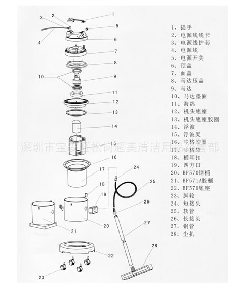 7.长期使用吸尘吸水机时,会因过滤网网眼的堵塞而致使吸力下降。为了防止吸力下降,应定期用水清洗过滤网以及布袋,洗后在阴凉处晾干再使用,即可恢复吸力.