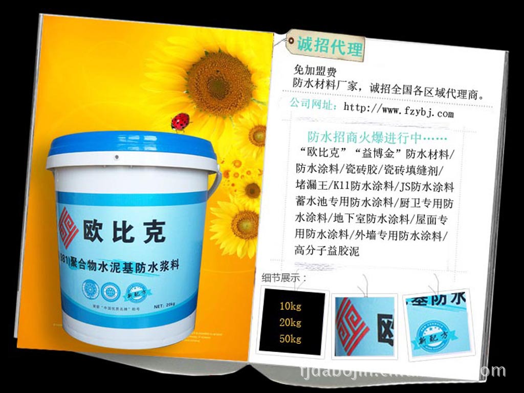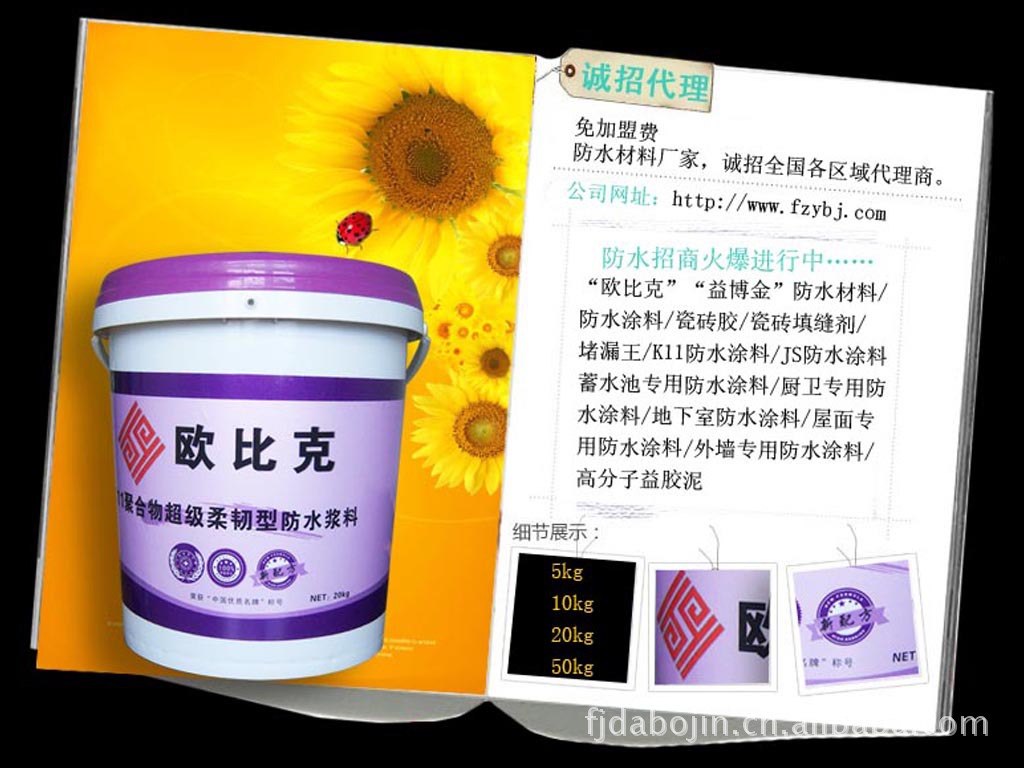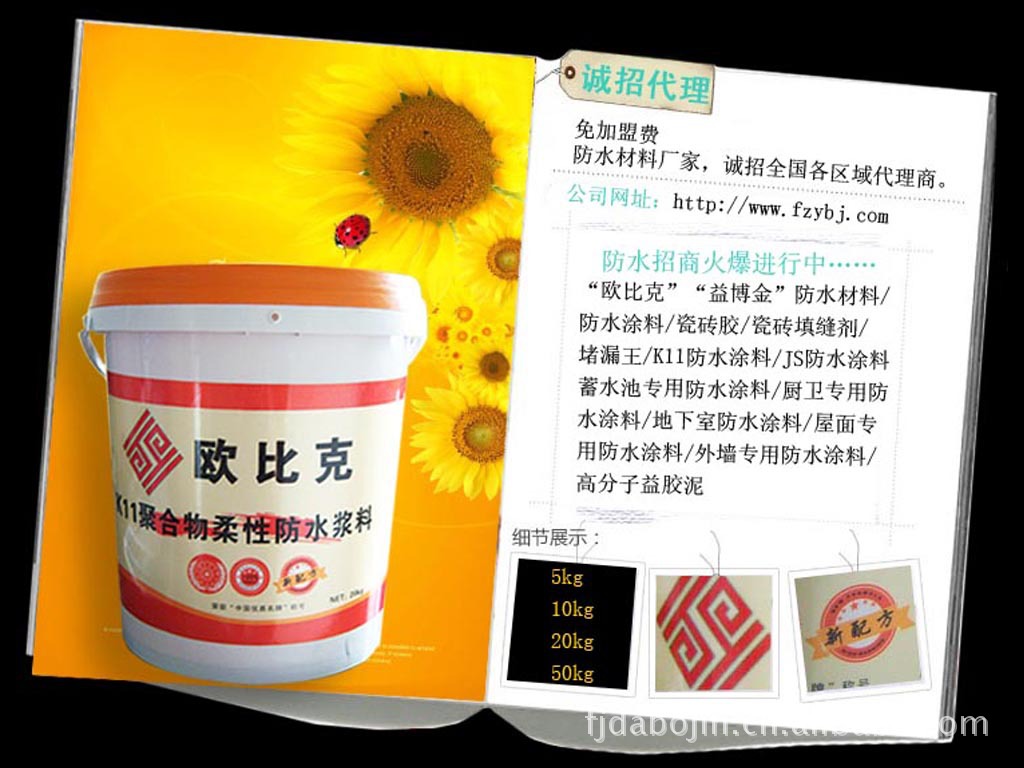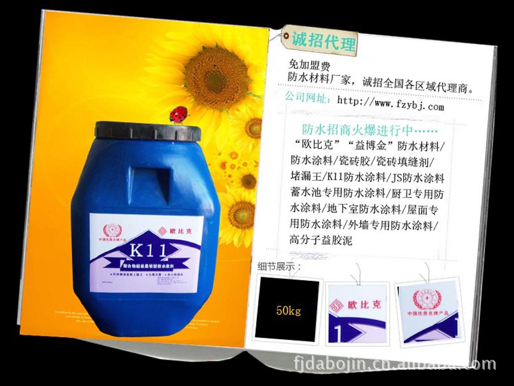 欧比克k11聚合物柔性防水浆料是双组份聚合物改性水泥浆料,既有无机材料耐久性,又有一定的弹性,防水、防潮、防漏、粘合力强,施工方便,是国家建设部推荐的绿色不保产品。