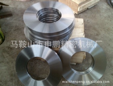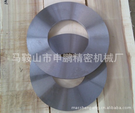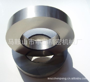 马鞍山申鹏精密机械厂生产的滚剪机刀片,滚剪机分条刀片,滚剪机圆刀片,专业选用:9CrSi、6CrW2Si、CMoV、H13K、LD、SKD-11 、SKH-2、SKH-51、M2、W6Mo5Cr4V2(SKH)、W18Cr4V、SK4、SK2、YG15、YG20等各种优质材料加工而成,硬度在54-65,锋利耐磨,可长时间不用换刀。经过一套完善的真空热处理工艺,硬度均匀,精密加工制做。分条机刀片是分条刀座中最重要的一环,其加工精密度,更是要求甚高。对于平面,需采用超精密平面研磨机床,以特殊研磨方法研磨而成,并经严格品质管制,保证所有成品厚度,平坦度均达0.003mm(max)以内。在完整的分条刀组中,还包括隔套、垫片等部分。其主要目的是使圆刀片之间能保持一定的宽度,及上下刀间之水平间隙调整用,常用垫片厚度在0.8mm-150mm之间。其硬度不论厚度规格,均在HRC45度以上,防止刮花碰伤,形坚固耐用。对于厚度公 差也同样要求在0.003mm以内。内孔、外圆表面经发黑处理,有效提高防锈性能。