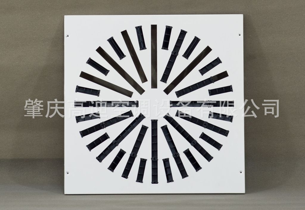 方形散流器具有良好的散流特性和美观的外形。广泛应用二空调系统中作送风口,其结构形式有多样,有1至4个不同方向散流的形式,能满足所有类型天花板的要求。散流器外框和内芯可分离,拆装容易,便于调节风量。根据使用要求,散流器后端可配置风量调节阀(OBD),铝质散流器外框和内芯采用优质铝合金型材制作,并经本色阳极化处理,阳极化膜坚实耐腐蚀。也可用户要求喷漆或着色处理。散流器外观轮廓明显,表面光洁明亮。本散流器,气流属贴附平送型。适用于播间室、医院、剧场、教室、音乐厅、图书馆、游艺厅、剧场休息奇想、一般办公室、商店、旅馆、饭店及体育馆等。为了使人们在各自环境里避免噪音的干扰以及不适感,除了要确定颈部风速外,需考虑安装高度及安装场合。
