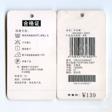 【体现厂商的责任心】为了让穿绳吊牌、穿线吊牌的多功能化,上面不仅可印产品是要用何种面料,其性能如何,甚至还要把洗涤服装的水温、洗涤方式.何种类型的清洗剂以及如何保养都要印在穿绳吊牌、穿线吊牌上,由此体现厂商对消费者是十分负责的。