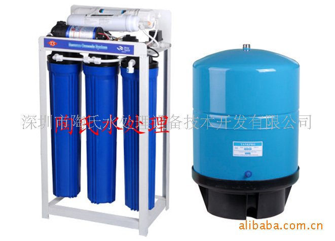 功能:利用超静压力泵产生高压渗透,使水分子和离子态的矿物质元素通过一层逆渗透膜,而溶解在水中的绝大部分重金属、有机物以及细菌、病毒等则无法透过逆渗透膜被截留(逆渗透膜上的孔径只有0.0001um,而病毒的直径一般有0.02-0.4um,普通细菌的直径有0.4-1um)